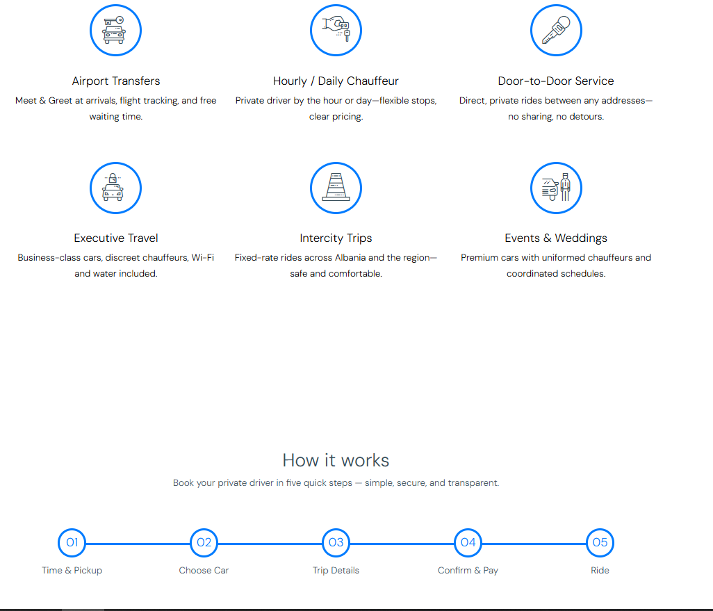 Premium private-driver service offering safe, punctual, and comfortable rides with licensed chauffeurs and a modern fleet across Albania.